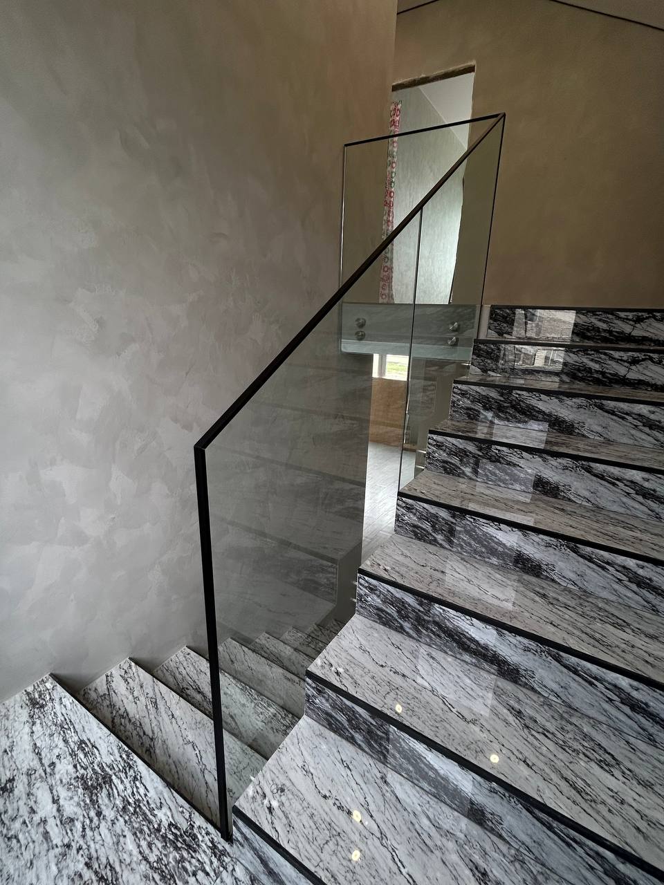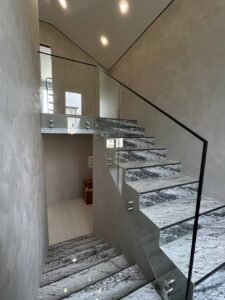 В зависимости от материала и конструктива лестницы может быть боковое крепление стекла (на точки или монеты) или верхнее крепление (на мини-стойки, зажимной профиль или полноценные стойки).